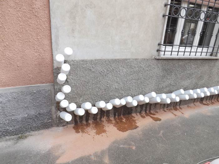 Inseriamo nel muro umido, con un sistema a lenta impregnazione a caduta, una potente barriera chimica a base di idrorepellente siliconico costituito da una soluzione acquosa di metilsiliconato di potassio che serve a creare una zona idrorepellente che per il fenomeno dell’inversione del menisco è in grado di impedire la risalita dell’acqua per capillarità.
